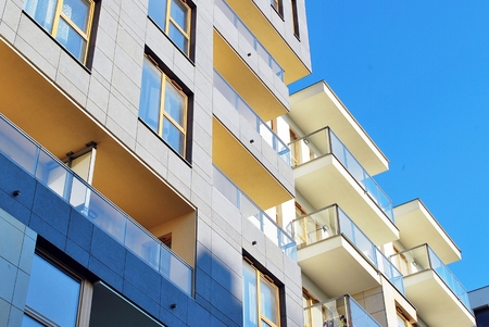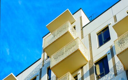 Detail of Modern residential flat and apartment building exterior. Fragment of New luxury house and home complex. Part of City Real estate property and condo architecture. Copy space. Blue sky