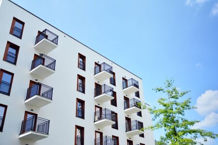 Contemporary residential building exterior in the daylight. Modern apartment buildings on a sunny day with a blue sky. Facade of a modern apartment building