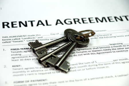 Rental agreement document on office table. Pen, house keys and money closeup