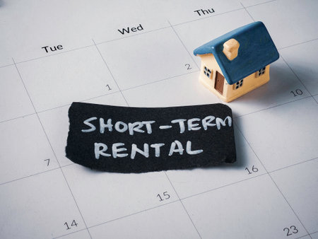 Miniature House on Calendar with Short-Term Rental Text: Concept for Vacation Property, Travel Planning, and Airbnb Strategy