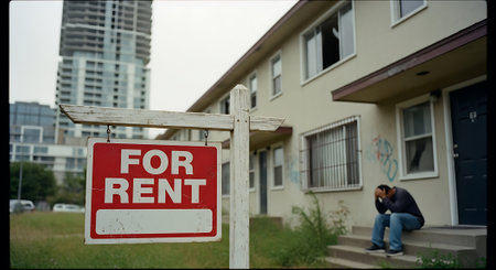 For rent sign with a sad man sitting on the stairs in the background