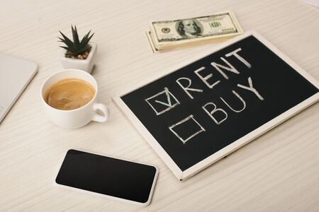 chalkboard with rent and buy lettering near cup of coffee, plant, smartphone with blank screen and money