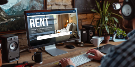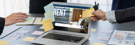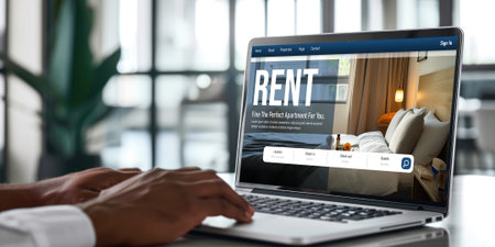 Man using laptop computer to search for real estate rental house or residential condo by internet