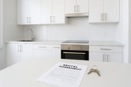 Modern white kitchen interior with rental agreement and keys on countertop. concept of real estate, home leasing, contemporary design.