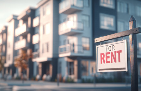 Bright red 'For Rent' sign stands prominently in front of stylish apartment buildings, highlighting urban lifestyle and available rental options in a vibrant neighborhood, AI generated