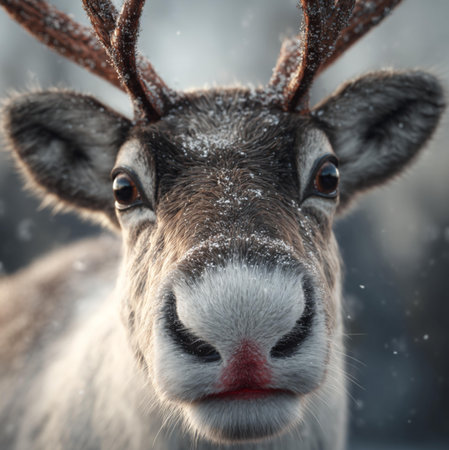 A reindeer with a red nose and antlers is standing in the snow. The image has a festive and joyful mood, as it is likely taken during the holiday season