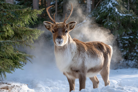 A majestic reindeer stands in a snowy forest, its breath visible as steam in the cold winter air. The animal has large antlers and is looking directly at the camera. Snow covers the ground and the branches of the evergreen trees surrounding it, creating a serene winter wildlife scene.