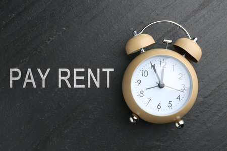 Time to pay rent. Alarm clock on dark gray stone background, top view