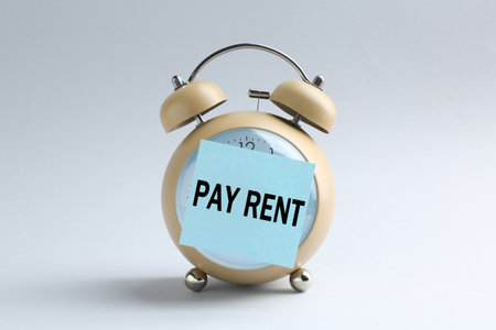 Paper note with text Pay Rent attached to alarm clock on light gray background