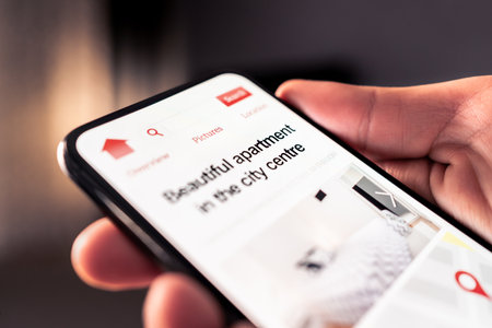 Rental property and apartment search with phone. House or vacation home for rent on website market. Internet research to find new condo lease or sale. Man using real estate marketplace in smartphone.