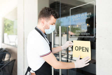 Side view of male staff putting open sign at entrance of cafe. Text in Spanish with working hours for Monday to Fridays, Saturday and Sunday