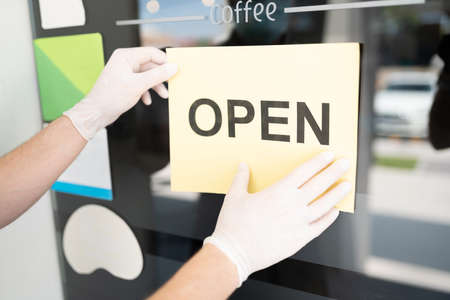 Hands of owners of cafe, restaurant or shop hanging notice announcing open