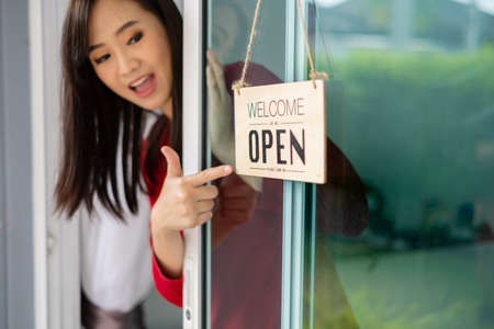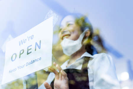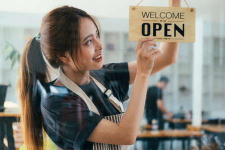 Woman opening store with sign board front door shop for service customer, Small business turning agian after the situation is resolved.