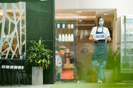 Welcome. Satisfied caucasian male waiter or barista showing signboard OPEN while standing at restaurant or cafe entrance wearing medical mask on his face and black apron and invites clients