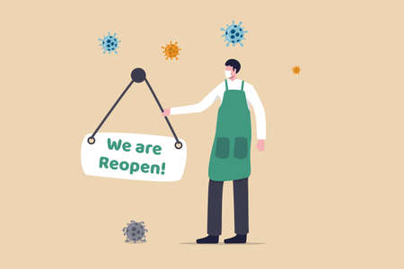 Company or entrepreneur reopen business after COVID-19 pandemic Coronavirus quarantine lockdown concept, shop owner man wearing face mask hanging store front Reopen sign with Coronavirus pathogen.