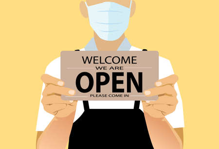 Barista holding sign board to open. We're open for takeaway ordering just in front of the concept store. counterbar.social distance when outbreak in city. vector, illustration