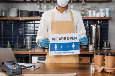 Cropped view of african american barista in medical mask and latex gloves holding signboard with we are open lettering in cafe