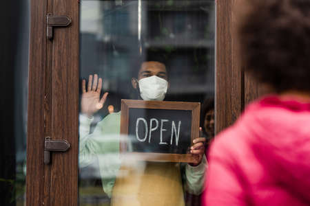 African american barista in medical mask holding signboard with open lettering in cafe near blurred client