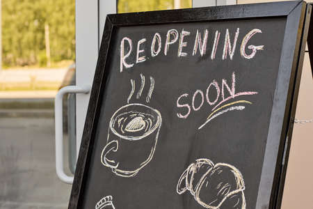 Reopening Soon Signage board in front of Businesses or Restaurant door after covid-19 or coronavirus outbreak - Concept of back to business after pandemic.