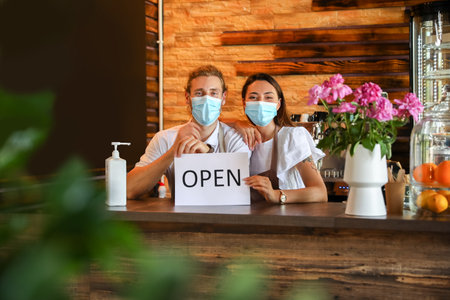 Business owners with medical masks and opening sign at table in their cafe