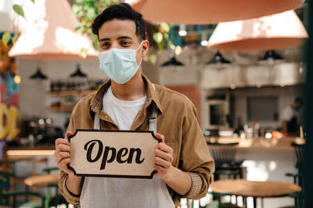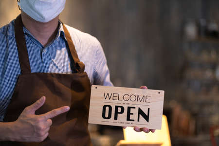 Coffee shop owner with face mask holding holding open sign after lock down and re-open again.