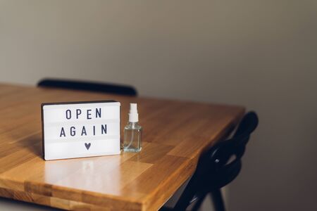 open again sigh on wooden table. local business reopen after quarantine covid-19