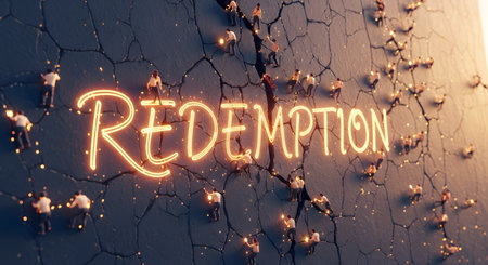 A powerful conceptual image where the glowing neon word 'REDEMPTION' is set into a massive, cracked wall. Miniature figures of people are working together with lights to climb and mend the fissures, symbolizing hope, healing, and collective effort in overcoming past faults.