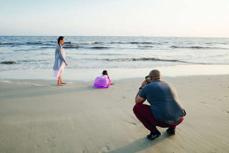 Woman standing behind and using a handheld camera to capture the sunset on the beach at sea The sea along the coast where fishing boats survive on outdoor holidays.