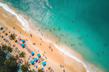 Tropical sandy beach with wave and turquoise water,copy space for text, aerial view. Ocean with waves and tropical beach. Summer and travel vacation concept