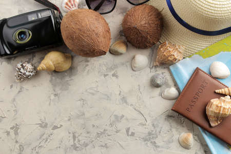 Travel concept hat, passport, map, camera and sunglasses on a light concrete background. top view