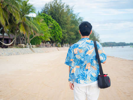Traveler man walking on the copy space beautiful beach landscape,Man with blue sky and ocean holiday