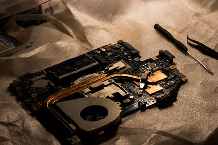 laptop motherboard. repairing broken laptop notebook computer. Electronic repair shop, technology renovation