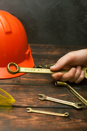 Protective helmet and wrench. Work accessories for production workers. Dark background.