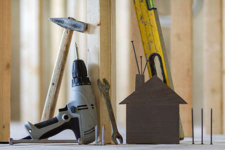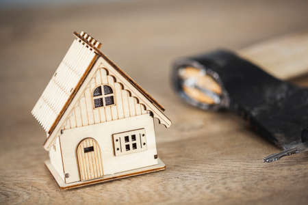 Close-up of small brown model house and building tools on wooden planks in unfinished room under construction background.