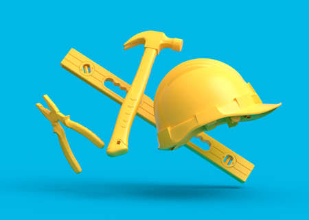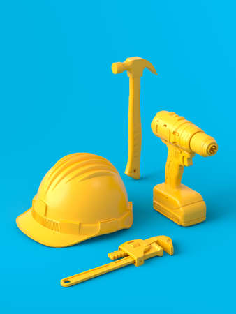 Flying view of yellow construction tools for repair and installation on blue background. 3d rendering and illustration of service banner for house plumber or repairman