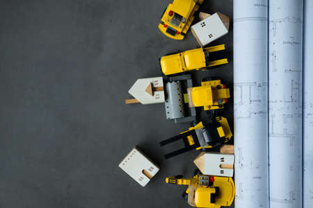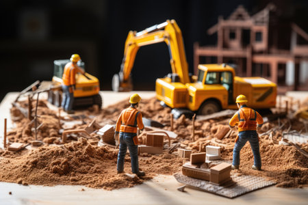 Plastic toy figures of construction workers with construction equipment at a construction site