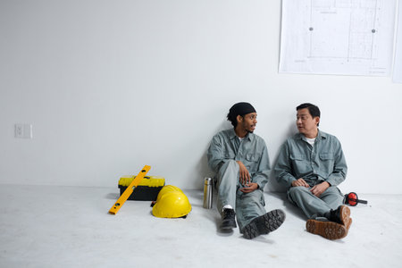 Construction workers renovating apartment hallway with tools and materials under natural light