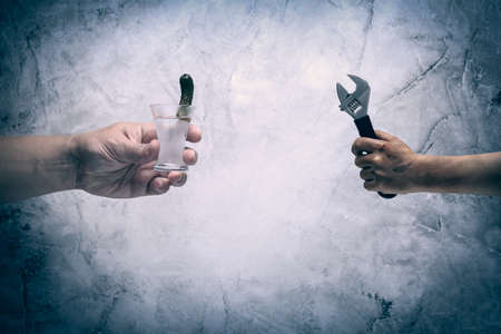 Drink responsibly! Abolish child labour! Adult hand with shot of vodka and dirty child hand with wrench. Grey background. Horizontal, toned