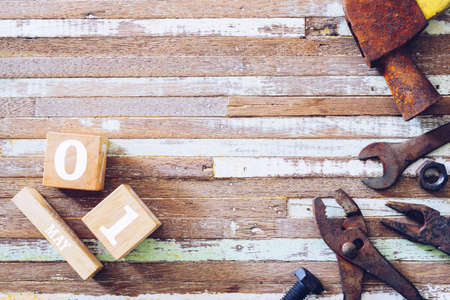 1st May. Happy International Worker's day or Labour Day background concpet. wooden block calendar 1 May and rusty handy tools on grunge wooden table texture background.