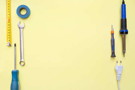 Repair tools on a yellow background. Measuring tape, screwdriver, soldering iron. Place for text. copyspace. flat lay. top view. Handyman toolkit. DIY. Advertising for the store.