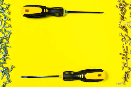 Self-cutters and two yellow screwdrivers on a yellow background with room for text. Banner with insides and fittings for a construction store or repair shop.