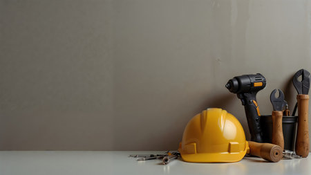 A top-down view of an industrial workbench featuring a hard hat and various tools, emphasizing a workspace for construction or repair activities.