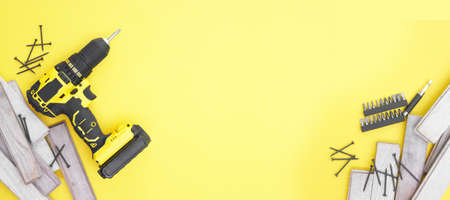 Yellow-black screwdriver on a yellow background, screws, a set of bits. Copy space.