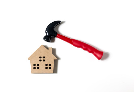 Hand holding a miniature steel hammer by a house shape made from black colored screws on a concrete background. Home repair and improvement concept.