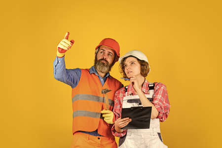Family counting finances for renovation. Redevelopment of home. Renovation concept. Couple planning changes renovation apartment. Couple looking at documents. Woman and man wear safety hard hat