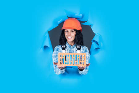 girl on a construction site in an orange helmet with a screwdriver and screw in hand. girl pensively looks away.