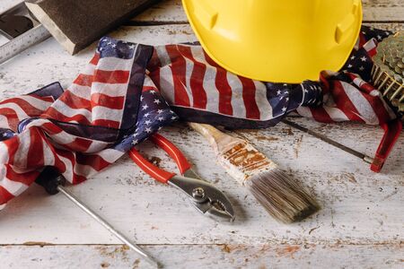 Top view design concept of Father's day and labor day with working tools on blue background.