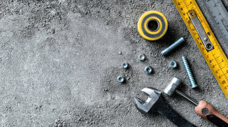 A flat lay image capturing essential tools and hardware accessories on a textured gray surface. Includes a steel ruler, wrench, screws, and other fasteners for various projects.