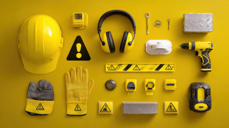 A vibrant arrangement of yellow safety equipment and tools, including a hard hat, gloves, and headphones, designed to emphasize safety in industrial environments.