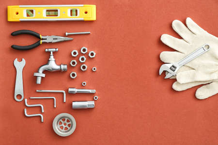Isometric view of monochrome construction tools for repair and installation on blue and yellow background. 3d rendering and illustration of service banner for house plumber or repairman